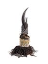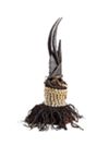 This antelope headdress consists of a hat-like woven part covered with black coloured barkcloth with fringes at the bottom. The upper part is covered with cowrie shells. An antelope head with vertical horns sits on top.
